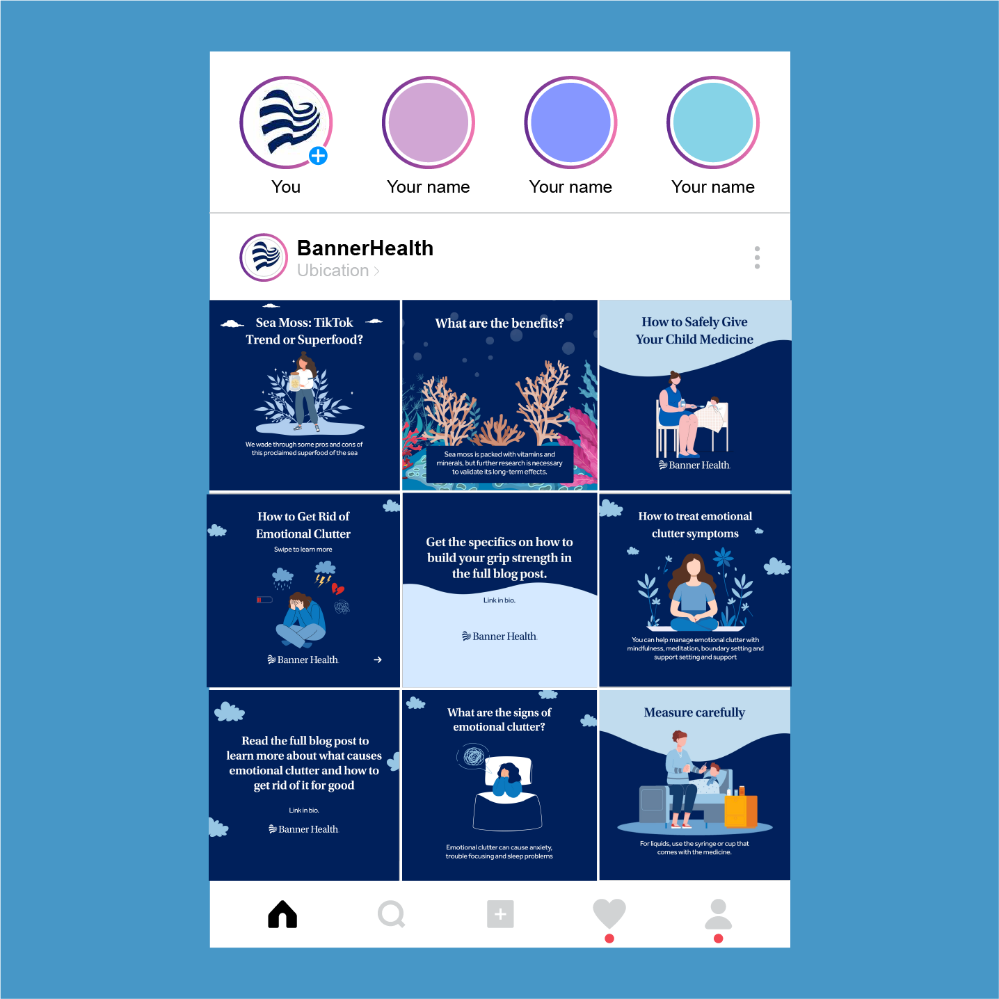 Banner Health social media posts were the main design projects I got to design for this account. Although Banner Health had a strict brand guideline, they allowed me creative freedom when it came to creating their social media posts.